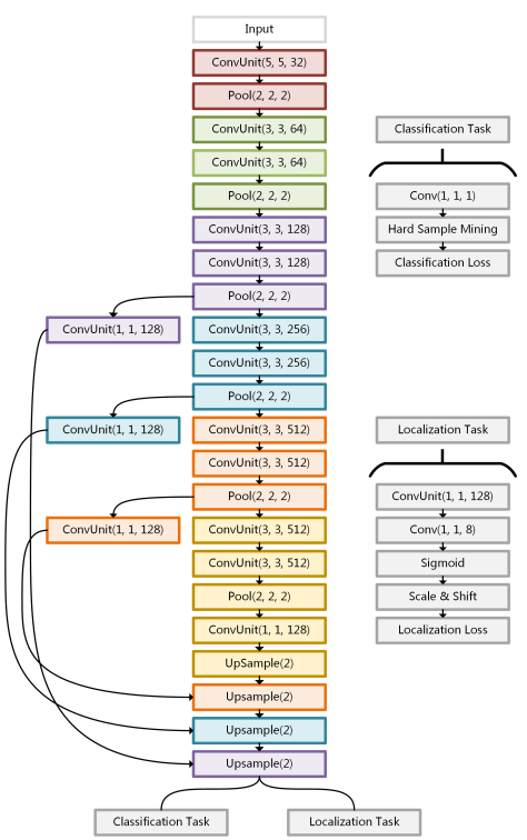 在论文中提到,在目标检测领域中将问题划分为分类与回归两大类,并将其构建成一个多任务学习框架。其中,在模型架构设计时借鉴了FPN(Feature Pyramid Network)的核心理念,在卷积神经网络的最后一层之后设置了两个分支模块:一个用于分类识别目标类别、另一个用于定位确定目标位置。具体而言,在卷积神经网络的最后一层之后设置了两个分支模块:一个用于分类识别目标类别、另一个用于定位确定目标位置,并分别计算出两者的损失函数值,并将这些损失按一定权重进行融合汇总得到整体损失函数。具体的实现细节将在后续章节中的“模型分析”以及附录中的“代码复现”部分进行详细阐述目前仅限于本节内容范围内的概述介绍