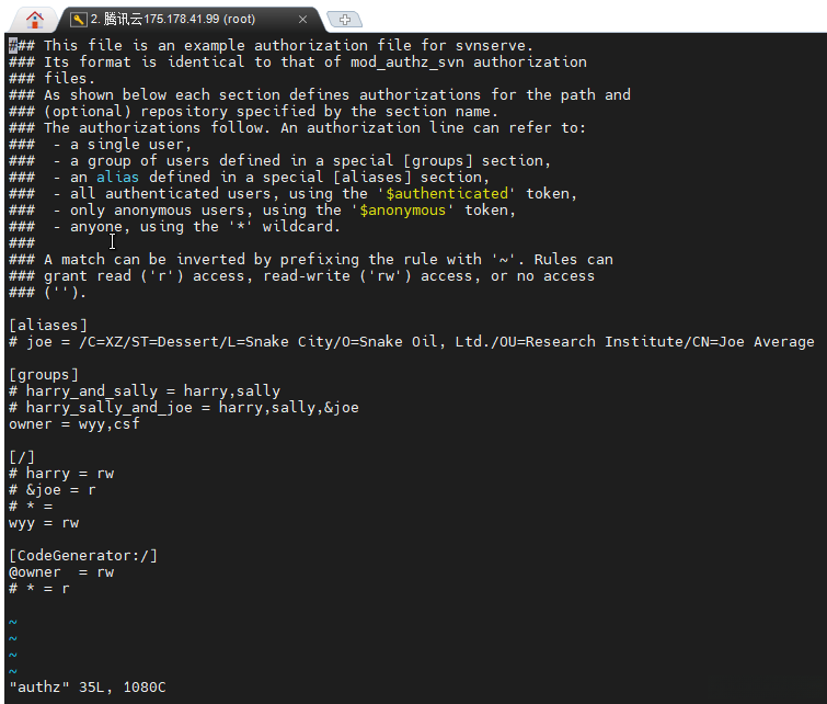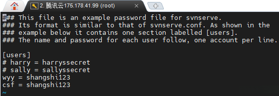 [svn:/] # 表示以下用户在仓库 svn 的所有目录有相应权限