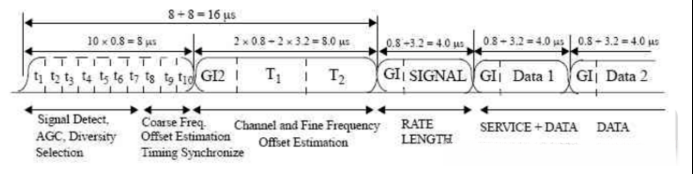 OFDM 的前导训练序列(Preamble training symbol)包括10个短训练符号(STS,用于自动增益控制、分集选择、定时捕获、粗频偏估计)和2个长训练符号(LTS,用于信道估计和细频偏估计),如图2。