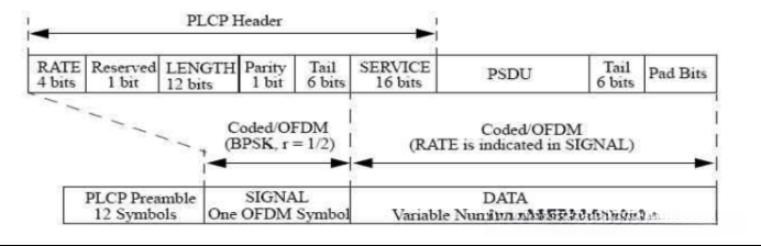 PLCP报头包含以下几个域:数据速率位(RATE)、保留位(Reserved)、数据包长度位(LENGTH)、奇偶校验位(Parity)和业务位(SERVICE)。在调制时,速率位、保留位、长度位、奇偶位以及值为0的6位尾比特构成一个单独的OFDM符号,用SIGNAL段表示。