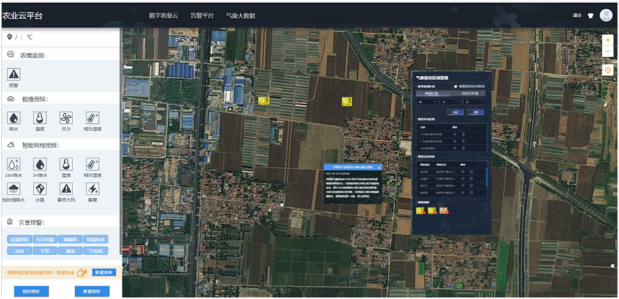 平台支持用户定制化设置为特定的气象预警区域,在这些区域内出现气象警报时,手机会收到自动发送的气象警告提示。通过这种方式帮助您及时掌握各类气象警报的信息及其严重程度,并采取相应的预防措施以最大限度地降低 农户 可能遭受的损失。