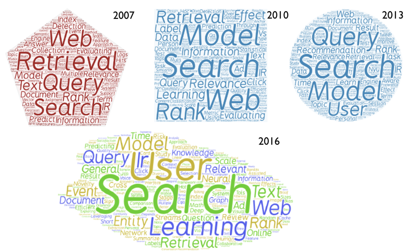 可观察到在2007年信息检索主要依赖一些无参数模型的情况较为普遍,在这种背景下包括PageRank、BM25和TF-IDF等方法的应用较为广泛。通常无需对模型进行参数训练即可通过排序与组合文档来获得结果。进入2010年后相关研究者们更加致力于发展新的评估机制并聚焦于用户的行为数据逐渐成为研究焦点的问题。随着时代的发展到了2013年个性化搜索问题获得了越来越多的关注推荐系统也逐步成为信息检索中的核心技术之一。随后于2016年间随着机器学习与深度学习技术的进步这两个领域的融合也愈发紧密其中"learning"这一概念更是成为了讨论的重点。