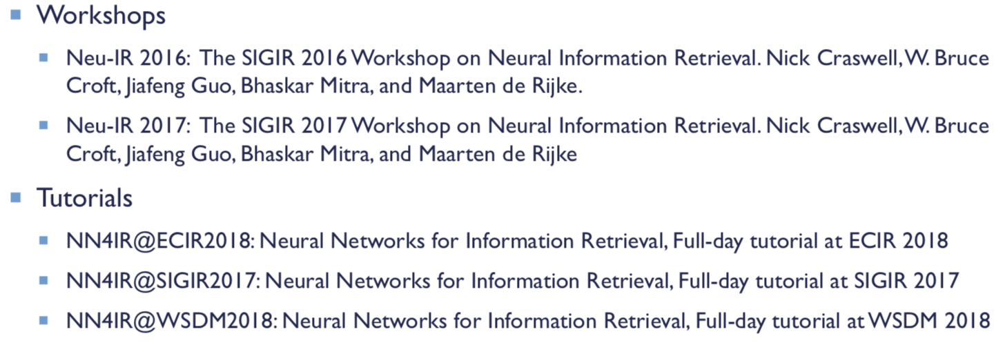近年来举办了若干workshops和tutorial,帮助大家了解神经网络在信息检索领域的应用现状以及未来的发展趋势。