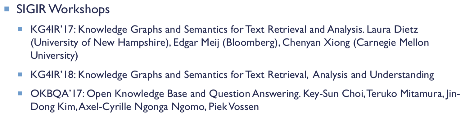近年来,在多个领域与知识图谱的深度融合愈发紧密;特别是在对话系统中的应用日益普遍;然而,在信息检索方面的主要难点在于如何根据用户意图进行有效的建模;由于查询词的数量有限且通常数量较少;当我们在尝试将查询词与文档之间的关联时;可以通过整合外部的知识资源来进行推理分析;下图展示的是SIGIR在应用知识图谱方向上的一些workshop: