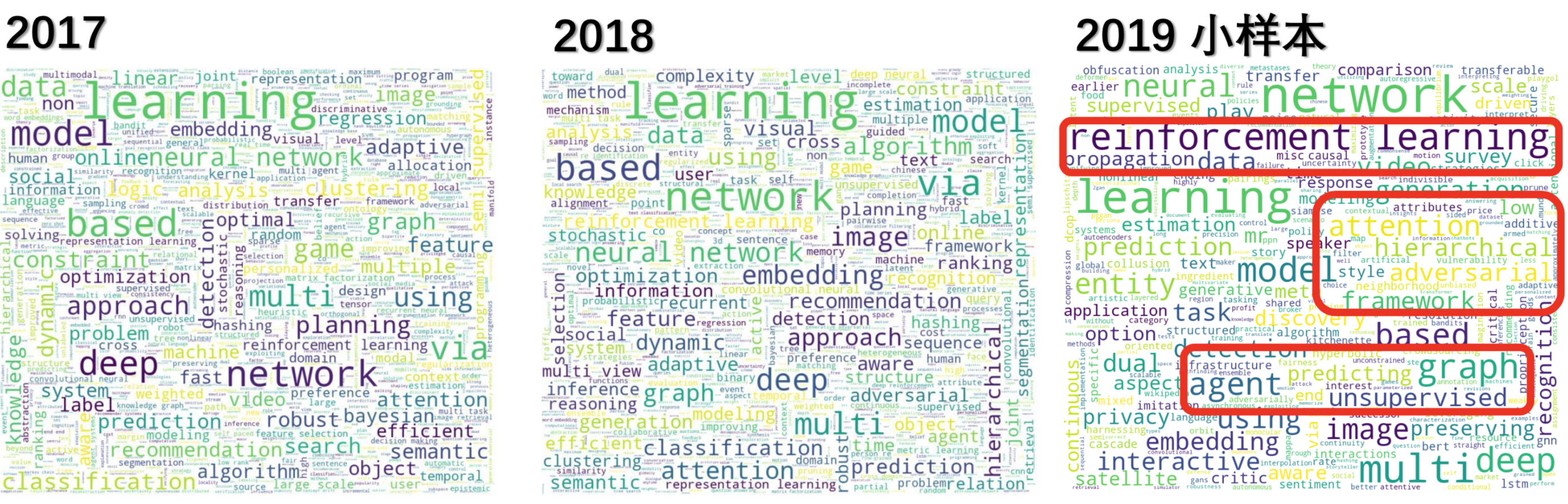 主讲人在这部分内容中阐述了自己的一些想法和疑问,在之前展示的趋势分析图中并未呈现'知识(knowledge)'与'推理(reasoning)'这两个关键要素。这一现象可能源于19年的词云数据集采用了小样本生成技术这一事实;由于IJCAI尚未提供完整的收录清单信息;因此这一缺憾尚待补全。就当前AI的学习模式而言,在实质内容上仍显不足;在知识支撑方面也面临着诸多挑战;这些问题确实值得我们深入探讨: