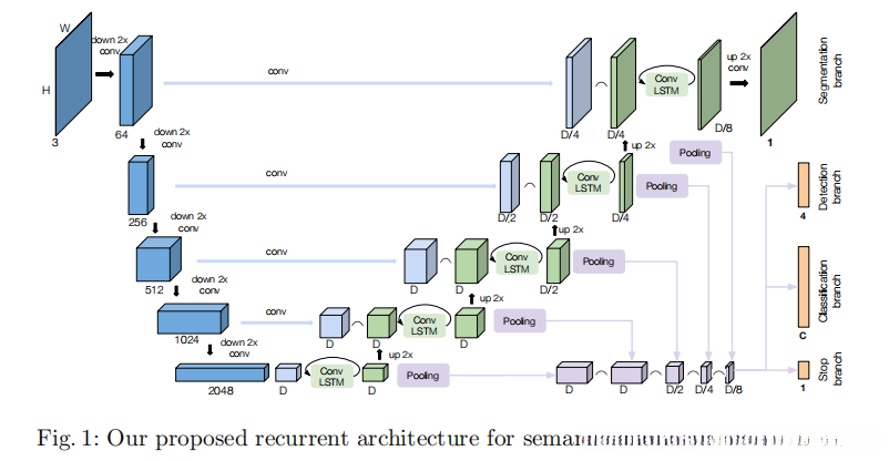 bbx,class,和stop prediction分支包含三个独立的全连接层以预测4个box坐标,分割目标的类别和time step t时的类别分数。这三个层的输入都是h_t,时用过concatenate 最大池化所有ConvLSTM的隐藏层得到的。Fig.1展示的是a single time step的recurrent decoder的细节。