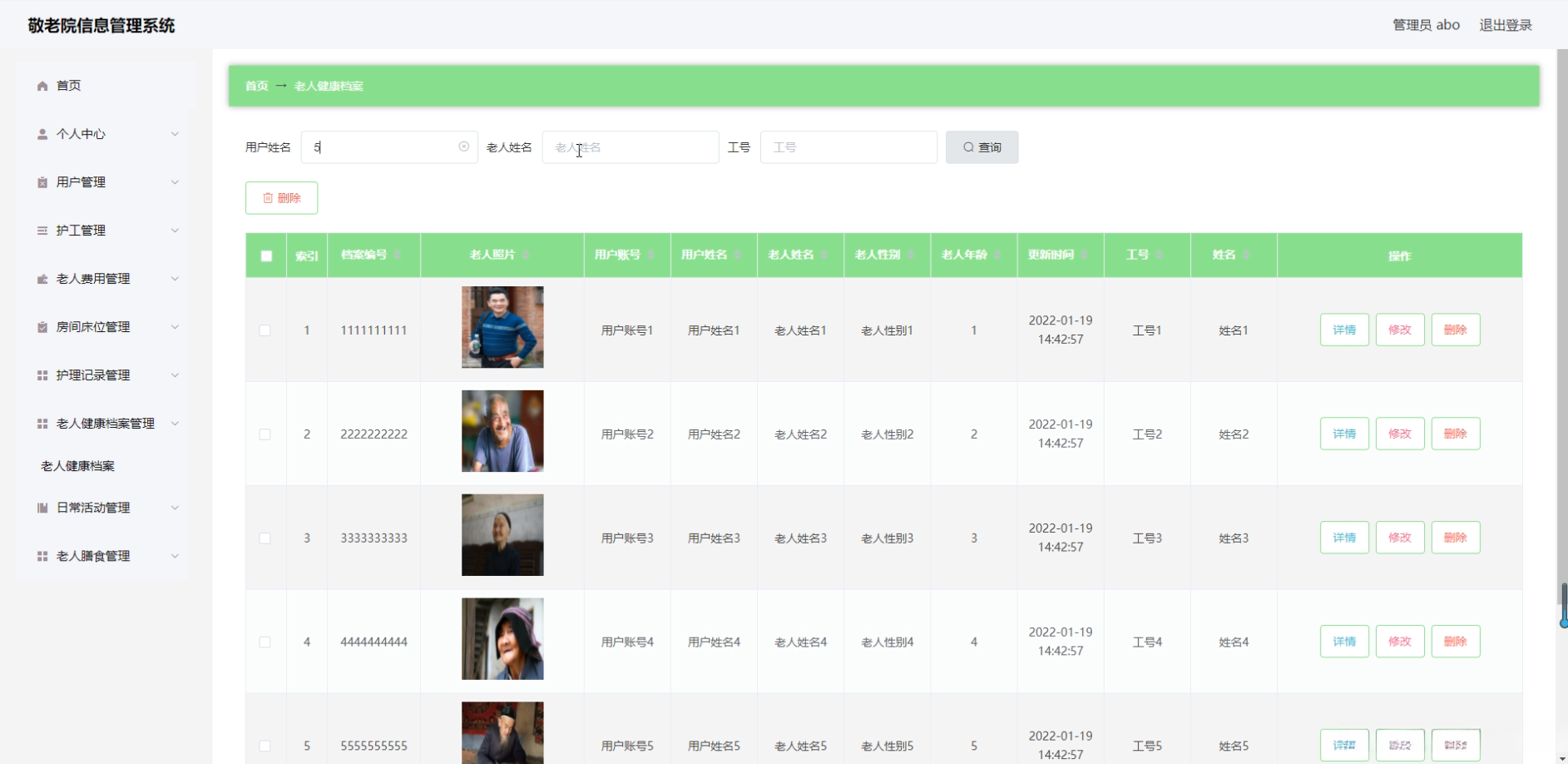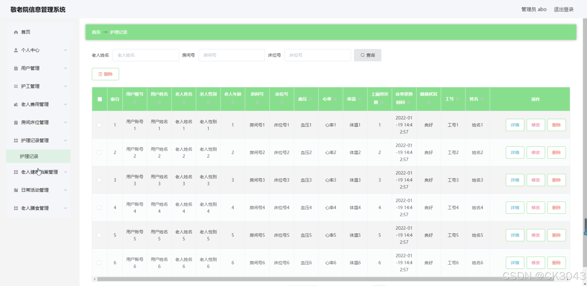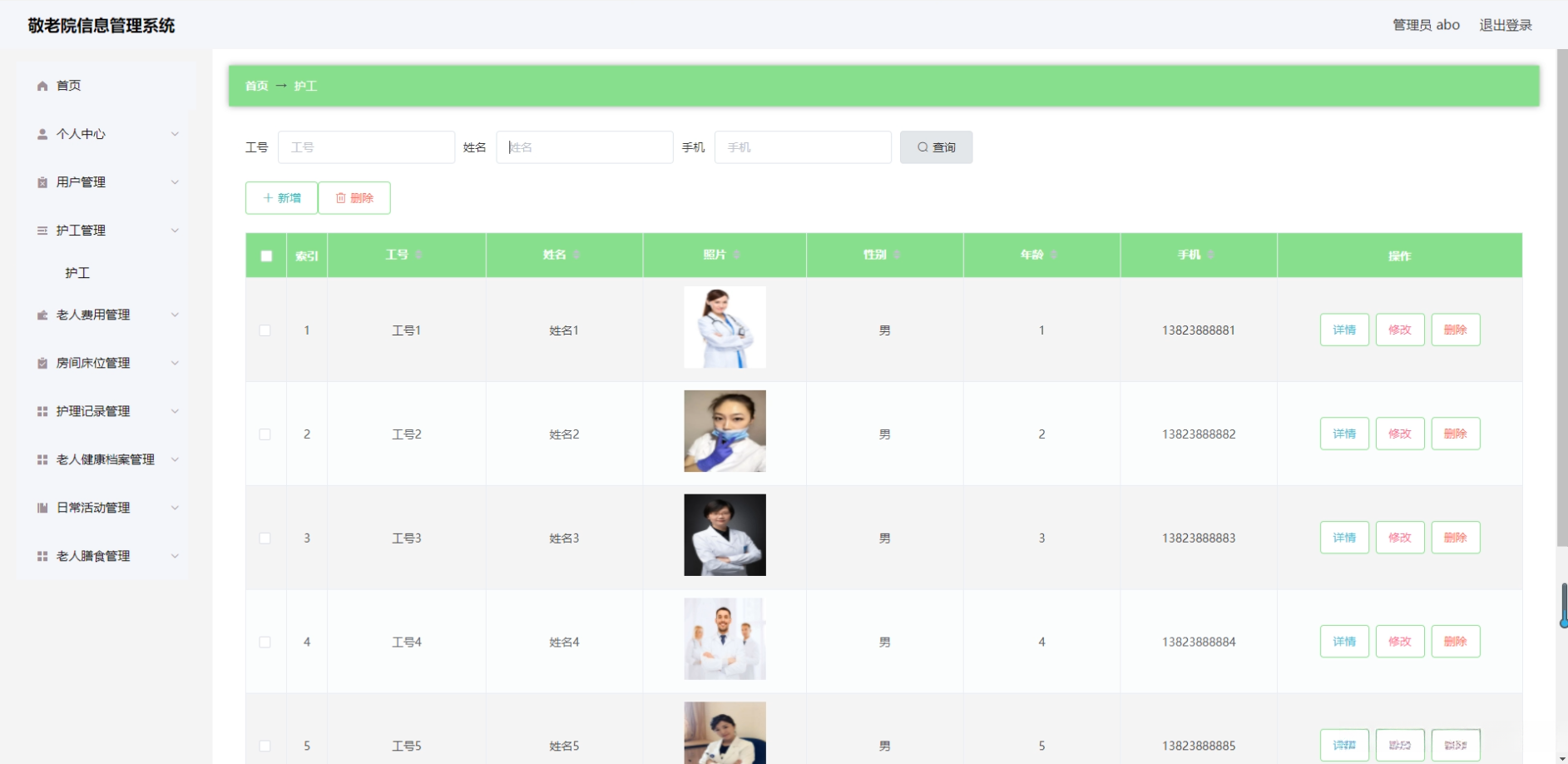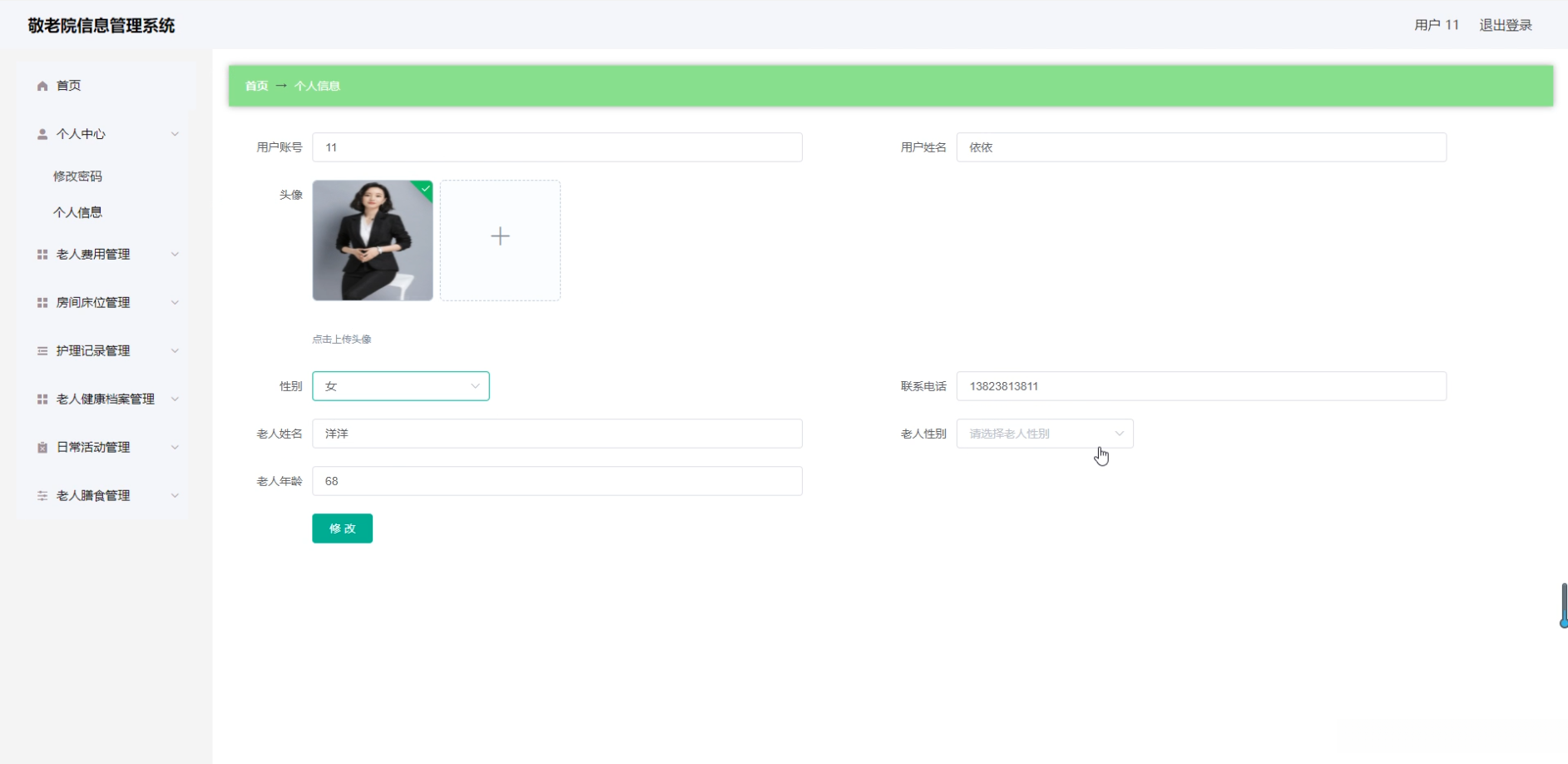 - 功能模块开发 :主要提供老年人信息管理、健康档案管理等核心模块,并同时提供员工信息管理、物资库存管理等功能模块支持。