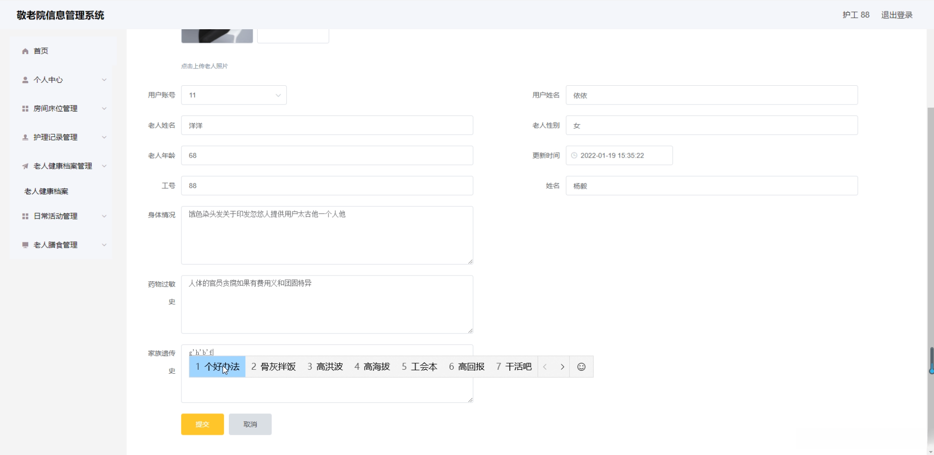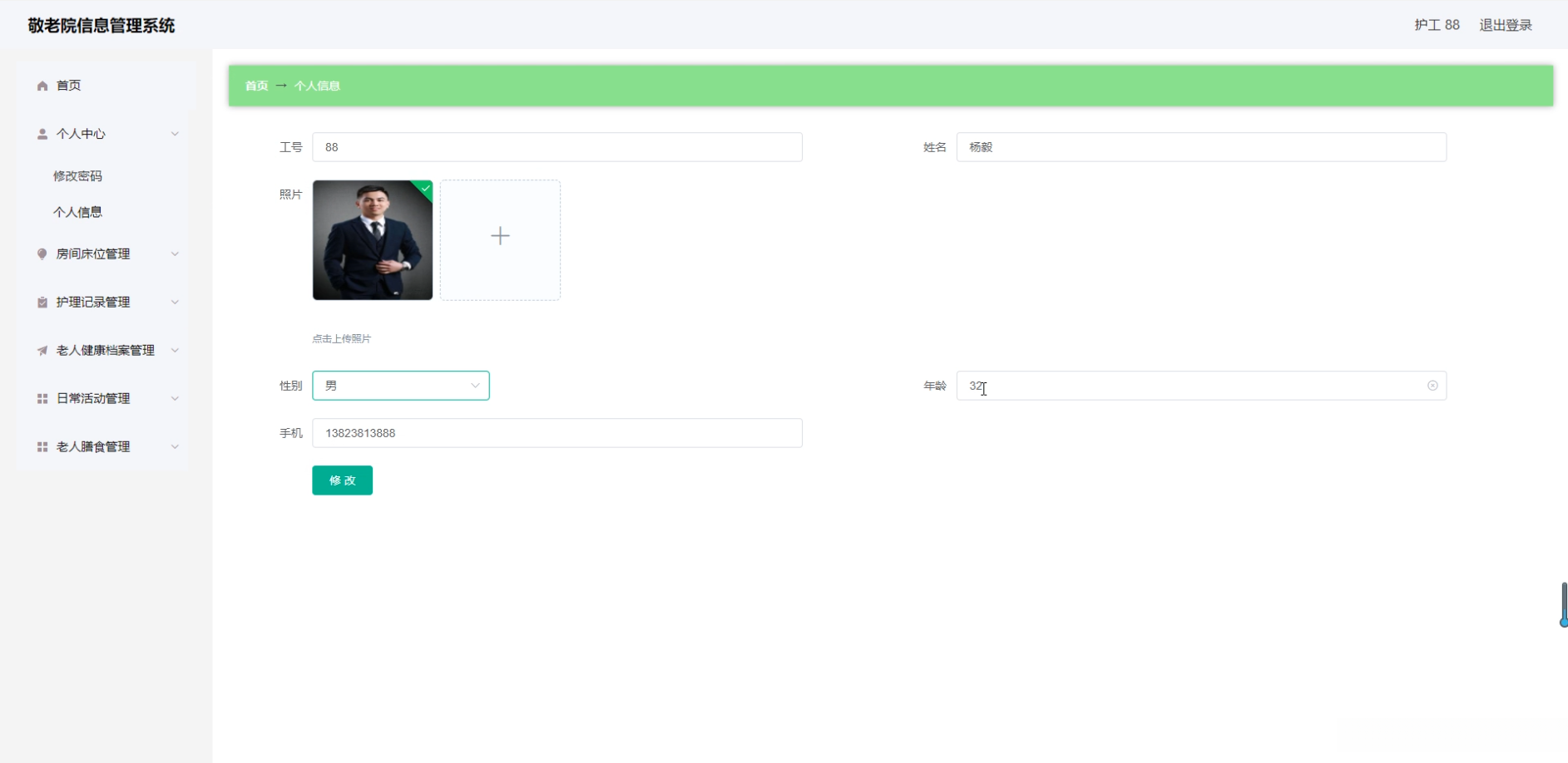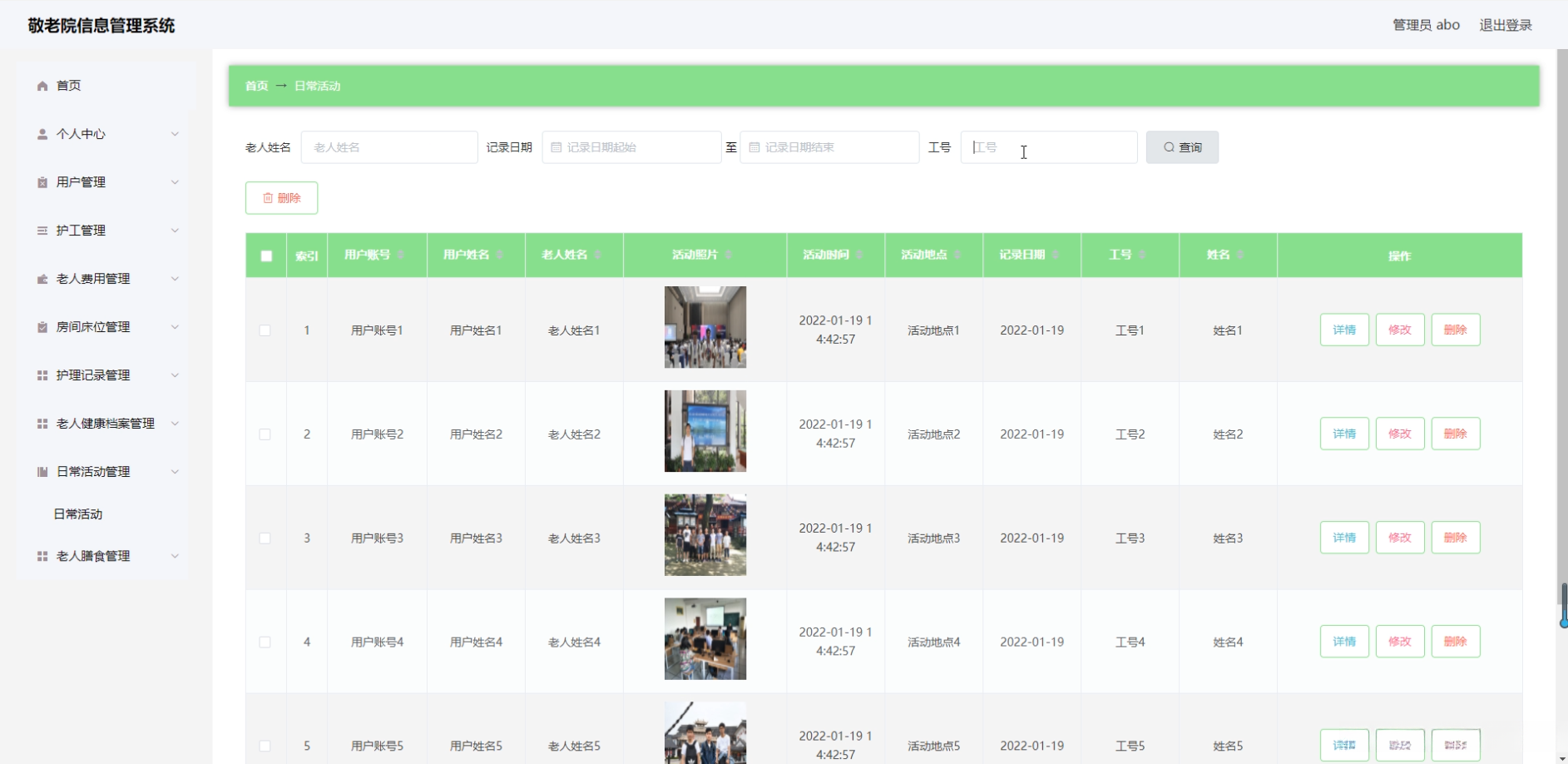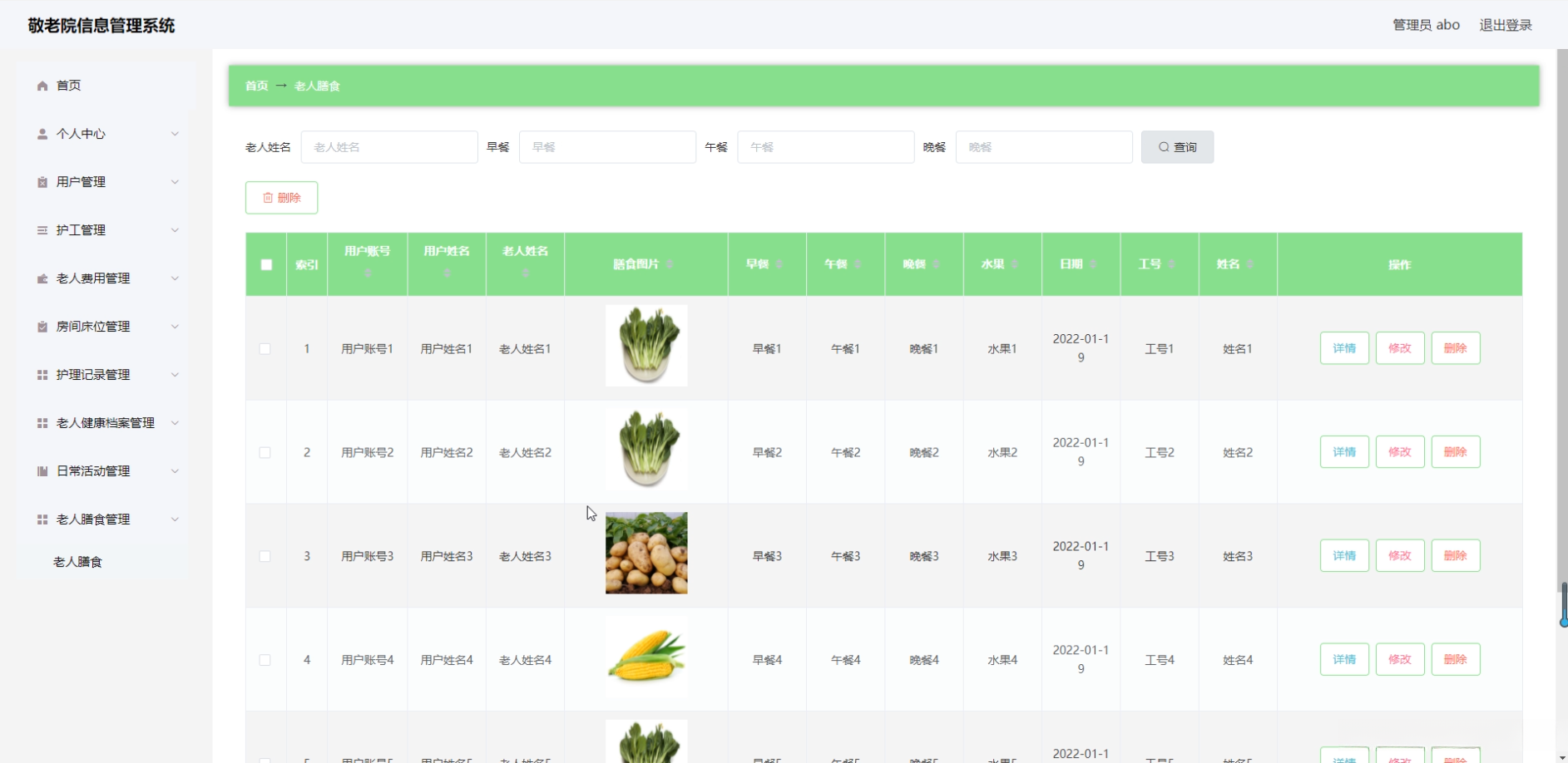 - 功能模块开发 :主要提供老年人信息管理、健康档案管理等核心模块,并同时提供员工信息管理、物资库存管理等功能模块支持。