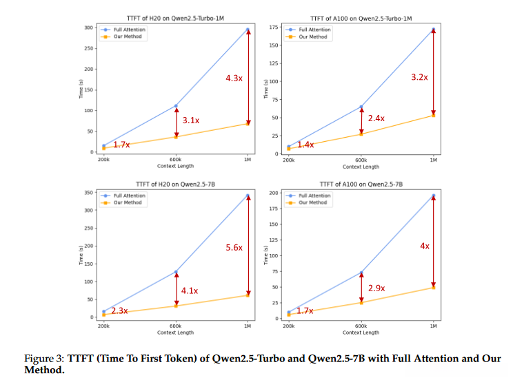 此外,图3展示了通义千问2.5 - Turbo在不同硬件配置下的首词生成时间(TTFT)情况。首词生成时间是衡量模型推理速度的一个重要指标,它反映了从用户输入文本到模型开始输出第一个词元所花费的时间。通过对比不同的硬件配置,可以看到采用了上述相关优化技术(如稀疏注意力机制等)的通义千问2.5 - Turbo实现了3.2到4.3倍的速度提升。这表明无论在何种硬件条件下,该模型都能凭借其优化的技术手段,显著提高长文本处理的效率,进一步证明了这些优化措施的有效性和通用性,使其在不同的应用环境中都能为长文本处理提供高效的解决方案。