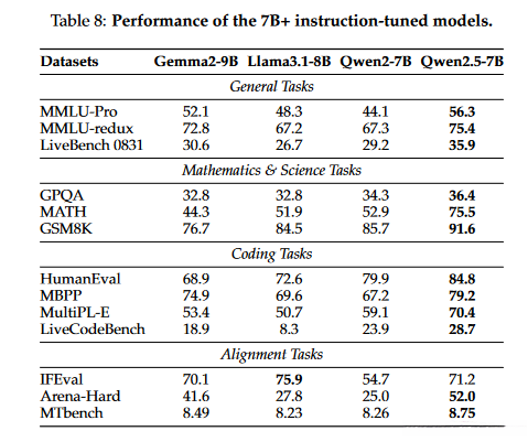对比情况与优势体现 :如表8所示,通义千问2.5 - 7B - 指令版模型在除指令评估(IFEval)之外的所有任务中,都显著优于其竞争对手——Gemma2 - 9B - 指令版和Llama3.1 - 8B - 指令版模型。这表明它在整体能力上有着很强的竞争力,尤其是在数学(在数学(MATH)测试中得分75.5)和编程(在人类评估(HumanEval)测试中得分84.8)方面展现出了明显的优势,说明该模型在这两个关键能力领域进行了有效的优化,能够在相对较小的规模下,为用户提供高质量的数学解答和编程支持,满足很多实际应用场景中对这两方面能力的需求。