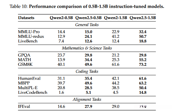 性能提升情况与应用优势 :这两个模型相较于它们之前的版本,性能有了大幅提升,具体细节如表10所展示。这种性能提升使得它们特别适合在资源高度受限的边缘环境下的应用场景,比如一些物联网设备、移动端设备等,这些设备计算资源有限、对模型的轻量化要求高,而改进后的通义千问2.5 - 1.5B - 指令版和通义千问2.5 - 0.5B - 指令版能够在这些环境中,以较低的资源消耗实现较好的语言处理功能,满足用户的基本语言交互需求。