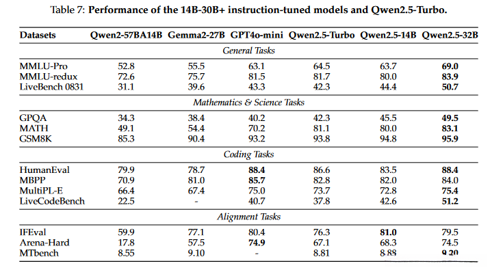 对比对象与目的 :针对通义千问2.5 - Turbo、通义千问2.5 - 14B - 指令版以及通义千问2.5 - 32B - 指令版这几个模型,将它们的性能与类似规模的基准模型,像GPT4o - mini、Gemma2 - 27B - 指令版以及通义千问2 - 57BA14B - 指令版(杨等人,2024a)进行对比,以此来明确它们在各自规模层次上的优势、劣势以及在同级别竞争中的位置。