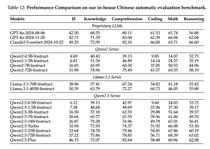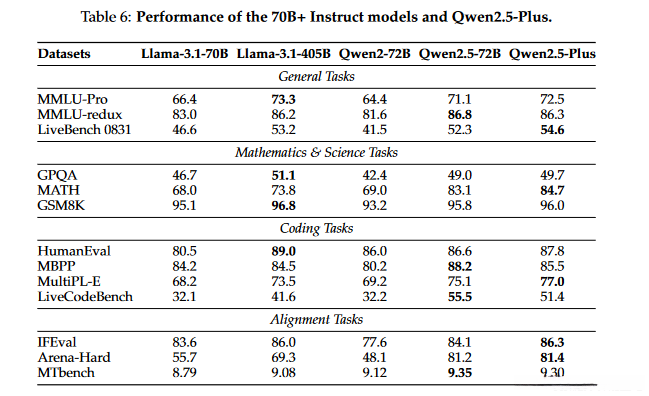 对比对象与目的 :将通义千问2.5 - 72B - 指令版和通义千问2.5 - Plus这两个模型与其他领先的开源权重指令调优模型,如Llama3.1 - 70B - 指令版、Llama3.1 - 405B - 指令版以及之前的通义千问2 - 72B - 指令版(杨等人,2024a)进行比较,目的是清晰地展现通义千问2.5系列在这一较大规模模型区间内的性能优势以及在同类型竞争中的地位。