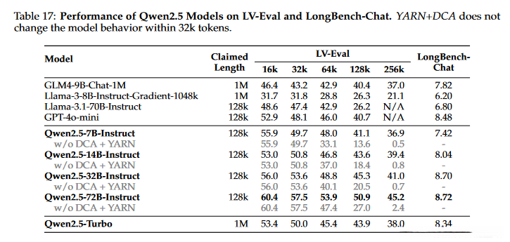 通过在上述三个基准上进行测试,相应的结果展示在了表16和表17当中。可以看到,通义千问2.5系列模型在运用了特定的长度外推技术(也就是动态卷积注意力(DCA) + 自适应循环神经网络(YARN))之后,展现出了令人瞩目的长文本上下文处理能力,在这三个数据集上都有着出色的发挥。