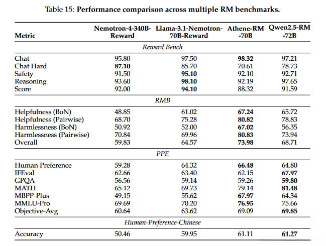 在人民币基准(RMB)上脱颖而出,取得最佳表现。这表明在面对与该基准相关的特定领域任务和复杂的语言交互场景时,它能够凭借自身独特的优势,深度理解相关领域的专业知识、语言规范以及业务逻辑,从而对智能体生成的回复进行精准评估,并给出契合实际需求的奖励反馈。例如,在涉及金融投资策略制定的语言任务中,它可以敏锐地识别回复中关于风险评估、收益预测以及资产配置等关键内容的合理性和专业性,准确判断其是否符合金融领域的实际应用要求,进而给予恰当的奖励,以此来引导智能体朝着生成更符合该领域期望的回复方向发展,体现出它在这个特定领域的适应性、专业性以及奖励判断的准确性方面相较于其他模型更胜一筹。