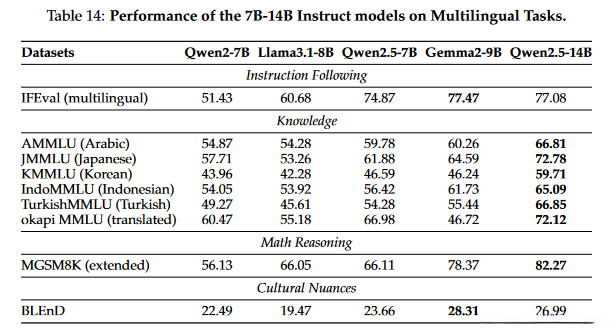 - 文化细微差别方面:利用了BLEnD基准测试(明等人,2024年)来评估模型捕捉文化细微差别的能力。这个基准测试是专门为测试语言模型对不同文化背景下的微妙之处的理解而设计的,因为不同语言往往承载着不同的文化内涵,模型能否准确理解和体现这些文化细节,对于其在多语言交互中的高质量表现至关重要。