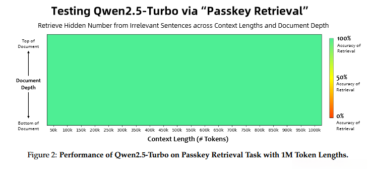 进一步来看,如图2所展示的内容,通义千问2.5 - Turbo在一个极具挑战性的100万词元(token)的密钥检索任务中,达到了100%的准确率。密钥检索任务通常要求模型从海量的长文本信息中准确地找出特定的关键信息(这里类比为密钥),这是对模型从超长文本上下文中捕捉详细信息能力的一种高强度考验。通义千问2.5 - Turbo能够取得这样的成绩,充分说明了它具备超强的信息提取和分析能力,即便面对超长且复杂的文本内容,也可以精准定位到目标信息,这种能力在很多实际应用场景中都非常关键,比如处理长篇的专业文献、复杂的项目文档等,帮助用户快速获取关键内容。