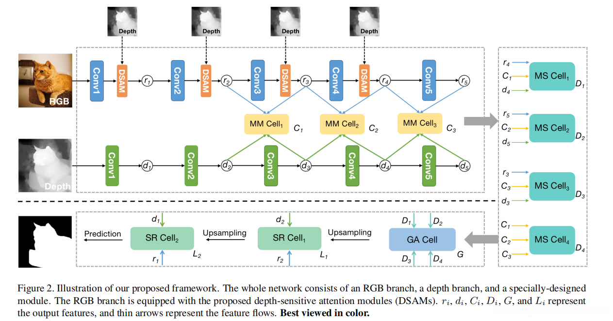 论文 design four types of cells:the multimodal fusion (MM), m ulti-s cale fusion (MS), global context aggregation (GA) and s patial information r estoration (SR) cells。First, we use MM cells to directly perform multi-modal feature fusion between RGB and depth branches. Second, we use MS cells for the dense multi-scale feature fusion. Third, we utilize GA cell to aggregate seamlessly the outputs of the MS cells for capturing the global context. Finally, we introduce SR cells to combine the low-level and high-level features to remedy the spatial detail loss caused by downsampling.