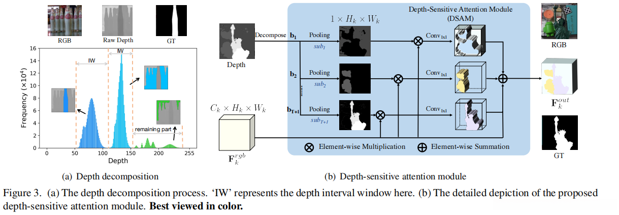 论文propose a depth-sensitive RGB feature modeling scheme, including the depth decomposition and the depth****sensitive attention module.
