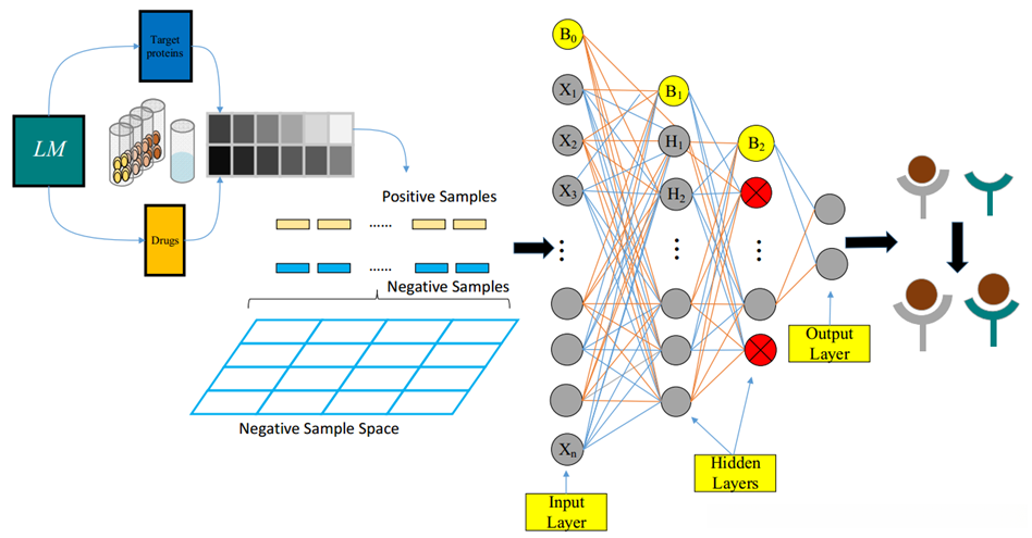 详细步骤:该方法的整体架构涵盖以下四个关键环节:特征融合模块、负样本选择过程、模型训练阶段以及DTI预测环节。