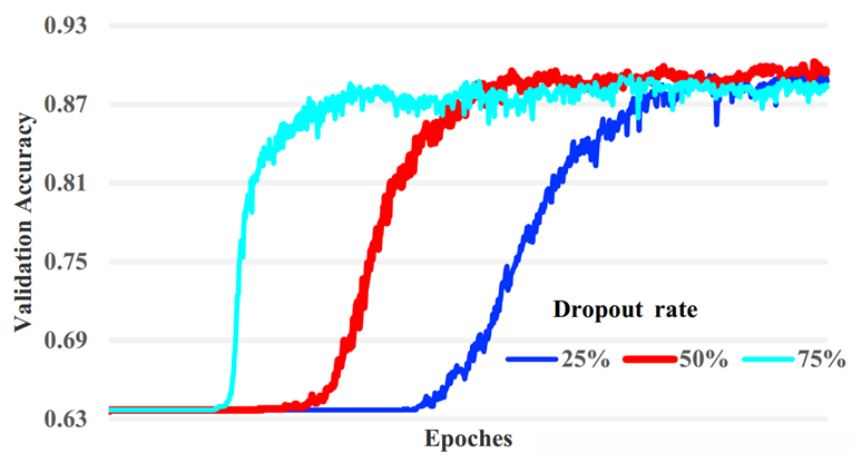 在 dropout比率设置为50%的情况下,DNN表现出最佳性能;具体表现为该网络架构能够集成2t个子模型结构(每个隐藏层拥有t个神经元)。