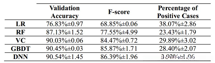 本文中所采用的DNN方法在F-score和验证准确率方面均优于其他方法,并且阳性病例的占比至少减少了6倍。
