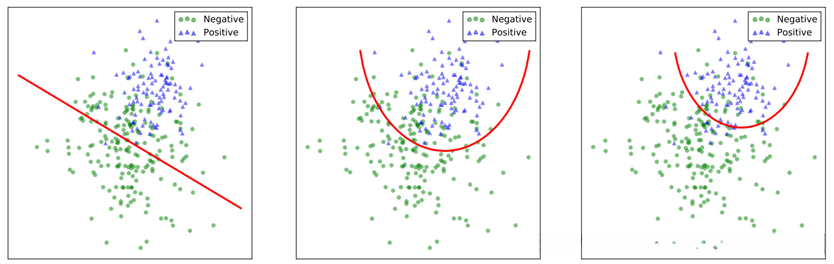 DNN通过非线性决策边界(中间图)来拟合训练数据, 而不是超平面(左边图)。最终的决策边界在训练过程中逐步逼近正簇。