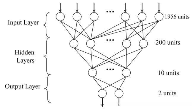 此网络架构包含一个输入级联结构(特征维度设定了数值大小),随后依次设置了两隐含层层级(分别拥有200和10个神经单元),并最终配置了一个采用Softmax激活函数的输出部分作为分类依据(其输出部分由两个神经单元构成)。研究者选择通过引入Dropout技术来优化模型结构,并基于该架构设计了一种新型深度学习算法用于预测药物与特定基因之间的相互作用效果。