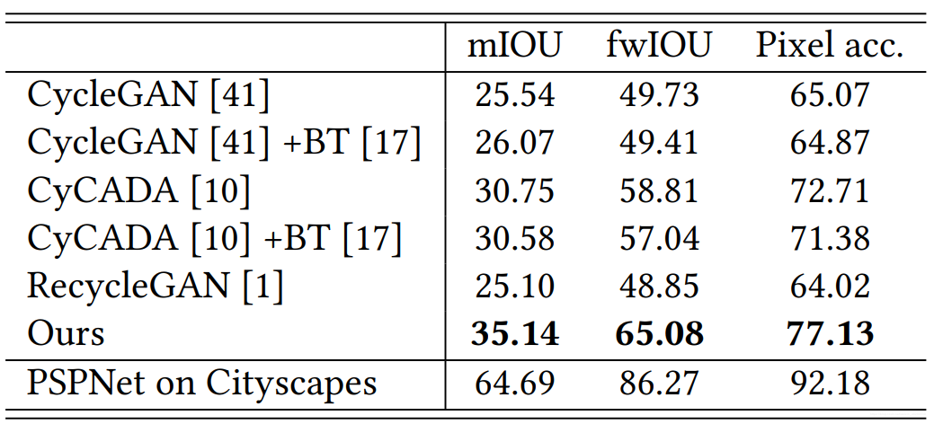 作者在一个自适应环境中进行合成视频数据(VIPER)到真实视频数据(CityScapes)的评估,并将任务设定为预测语义标签的映射关系。实验结果如表所示。