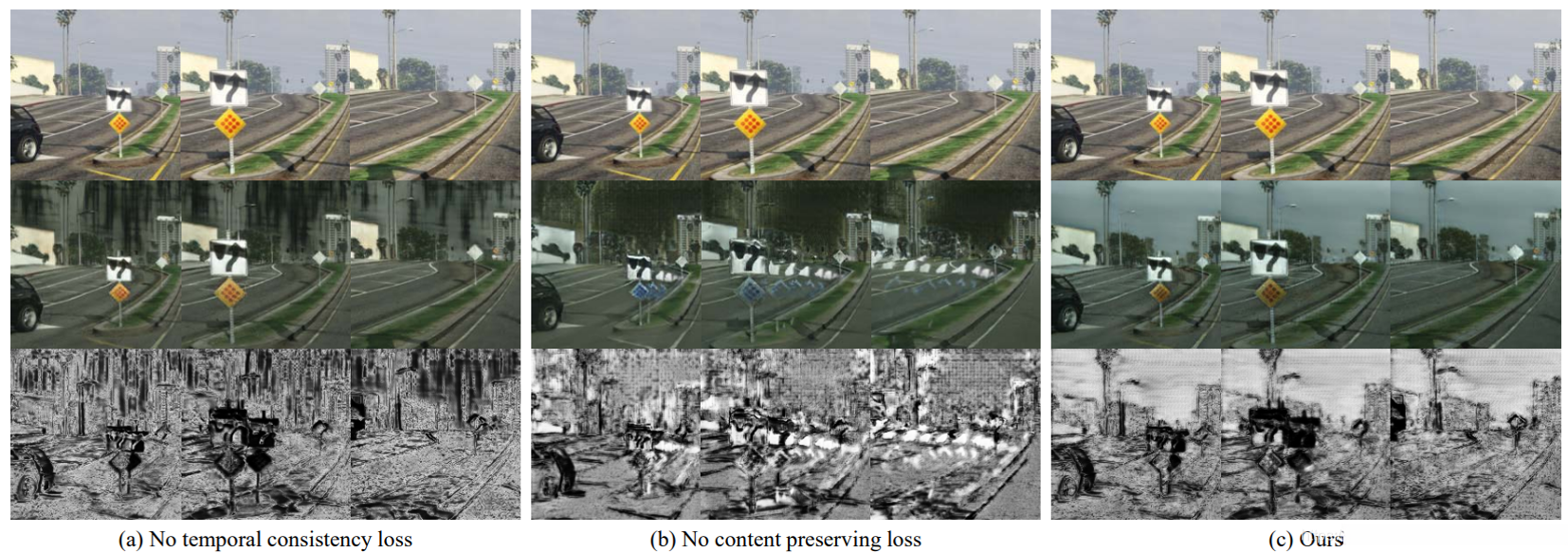 其中IN(\cdot)和VGG(\cdot)分别代表instance normalization与VGGNet。作者采用VGGNet的第五-三层特征图,并引入上述损失函数,则可促使转换前后对应的视频帧保持一致的语义意义。