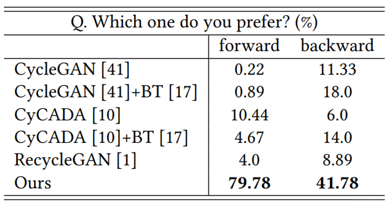 作者还进行了一个真人用户参与的实验来评估翻译视频的视觉质量。该研究选取了总共30个待评价视频样本。其中15个基于前向映射框架VIPER生成,并转导至Cityscapes数据集;剩下的15个则采用后向映射方法获得。对于每一个测试样本,在实验过程中始终作为初始展示,并在同一界面实时呈现各模型预测结果。