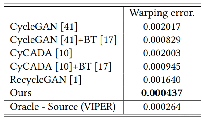 实验通过VIPER数据集中的真实光流进行图像变形处理。根据表格数据对比可知,在与现有多种算法进行比较时,在本研究中提出了一种新型的方法,在时间和空间维度上对变换后的结果进行了全局统一的正则化处理。其中所述的后期处理手段通过强制约束视频的时间一致性来降低由于光流变换导致的时间误差。然而,在本研究中提出了一种新型的方法,在时间和空间维度上对变换后的结果进行了全局统一的正则化处理。