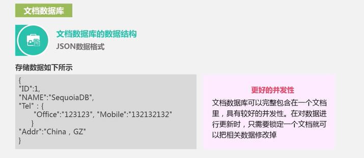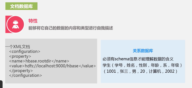 (数据不规则)每一条记录都对应了关系数据库中一行;嵌套对于关系数据库是多表连接的结构;不包含外部引入,读完一行就把所有信息读完了(好处:进行记录移植时,只要把一个文档迁移到其他机器上面,不用考虑别的表。而关系数据库需要锁定其他表,迁移时要把其他关联的表也迁移走)。