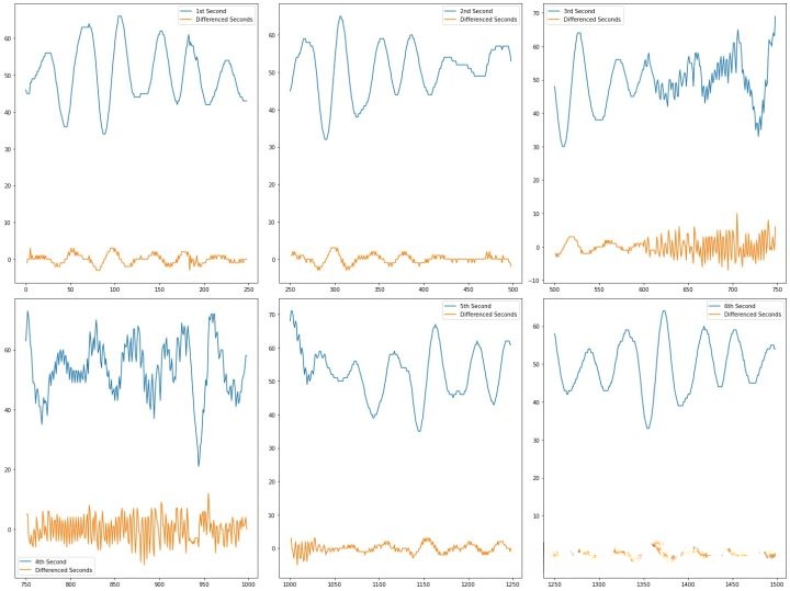 axes[0][1].plot(test1.index[250:499], test1.Amplitude[250:499].diff(), label='Differenced Seconds')