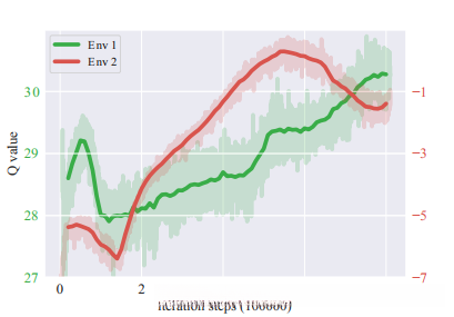 环境1与2使用不同的y轴,y轴代表的是每个批次q的均值。由于环境2更容易碰撞,所以其q值要小于环境1。
