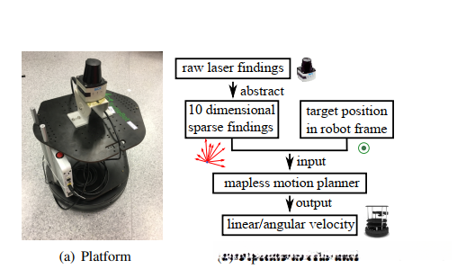 由于可见光与wifi定位技术的发展,移动机器人可以获得一个实时的相对位置。但在没有全局障碍图的情况下,仅仅有实时位置仍然很难做出全局规划路线。本文提出了,用异步深度强化学习算法来训练机器人在没有障碍图的情况下,仅仅使用十维的稀疏特征值与实时位置就能输出机器人的线速度与角速度,能够从当前位置移动到目标位置。