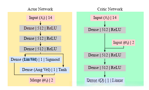 首先是14维的输入特征向量,其中有10维是激光探测器的输入信息,另外两维是上一时刻的线速度与角速度,最后两维是机器人的实时位置。对于Actor网络而言,输入经过三个全连接层后,分别用sigmoid函数与tanh函数激活,因为线速度保证非负,最后融合成二维输出动作action。