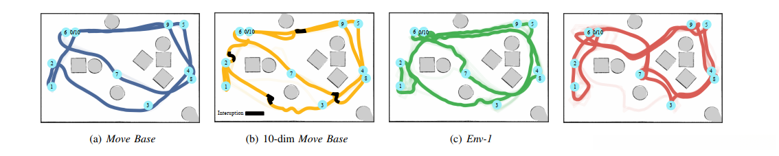 这两个环境都是模拟了10*10 平方的室内环境,白色的代表障碍物,黑点选用的是斑龟机器人,环境2相对来说障碍物更加紧凑,学习起来更为困难。在单一的Geforce GTX 1080 GPU上用Adam优化器训练近20h的结果如下:
