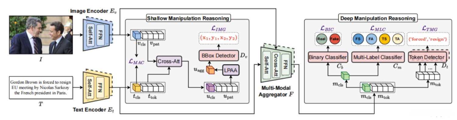 针对此思路,在如图所示的基础上(或以如图所示为依据),本文提出了一种新型的多模态层次化篡改推理模型HierArchical Multi-modal Manipulation rEreasoning tRansformer (HAMMER)。该模型以构建于采用双塔结构进行多模态语义融合与推理的架构体系为基础,并通过分层式的浅层与深层篡改推理机制实现对多模态篡改信息的精确检测与定位过程