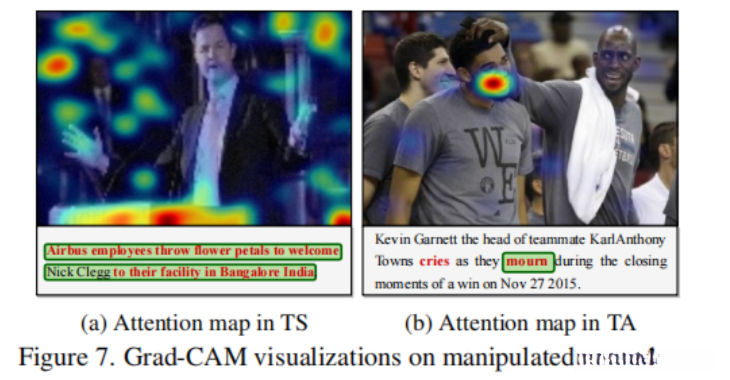 实验结果展示了多模态篡改检测与定位过程的具体可视化分析。研究者指出该算法能够有效地同时完成文本篡改检测及定位任务,并对被篡改单词处模型注意力分布进行了详细展示。此外,该算法还提供了关于被篡改单词处模型注意力分布的可视化信息。进一步研究表明,该算法通过聚焦于与篡改文本语义存在不一致性的图像区域来实现多模态的数据完整性评估。