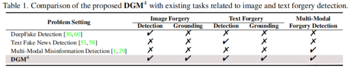 本文提出的DGM4与现有的图像和文本伪造检测相关任务的比较