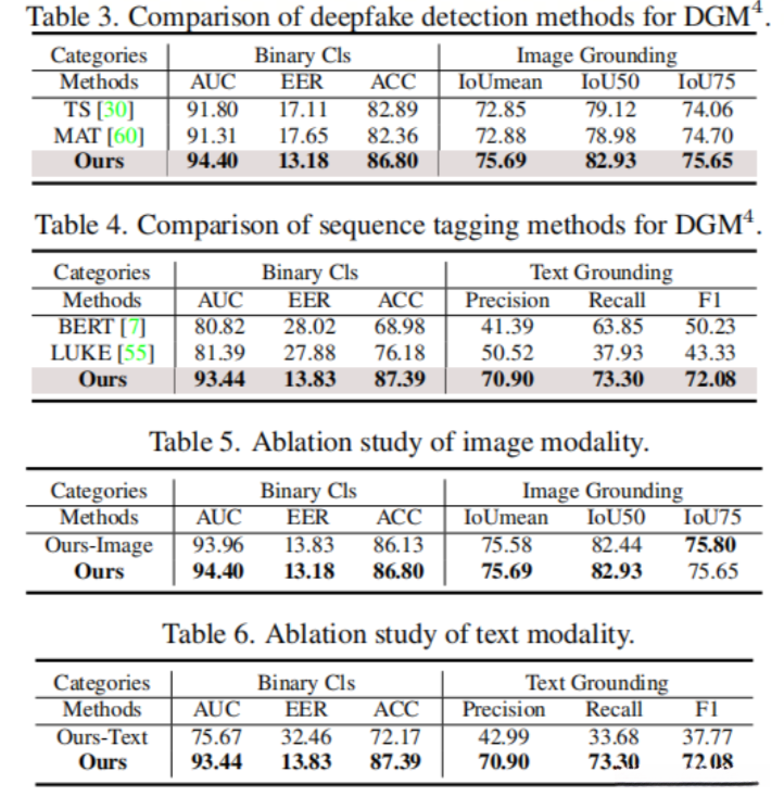 如图所示, 通过实验结果可以看出本文作者所提出的HAMMER方法在检测能力方面均优于其他多模态与单模态检测方法, 并能够实现对多模态信息篡改的精确识别和定位.