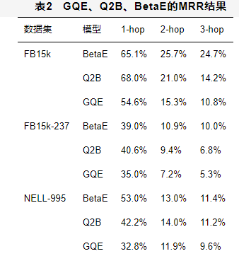 表2展示了以逻辑为基础的模型(GQE、Q2B(Query2Box)、BetaE)在FB15k、FB15k-237和NELL-995 3个数据集上进行多步推理的结果。