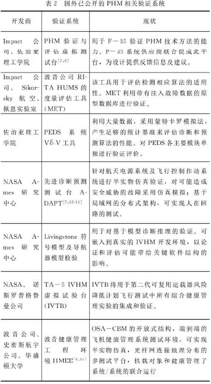 通过验证评价可以确定PHM设计方案是否满足预期目标,并进而为方案优化和改进措施的制定提供依据。在整个PHM生命周期中扮演着不可或缺的角色。美国已公开的PHM验证系统如表2所示。