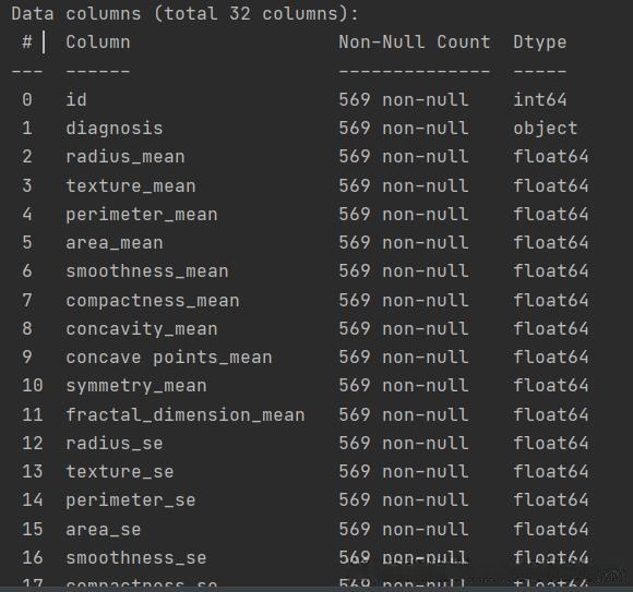 诊断结果字段(diagnosis)仅取两种可能,B或M,我们可以通过将其数值化处理将其转换为0或1的形式。