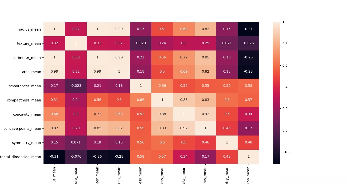 热力图对角线处显示单变量自相关的值为1;颜色较浅处表示变量间关联程度较高;从图中可见radius、perimeter和area具有显著的相关性;而compactness、concavity和concave_points之间也存在较强的关联关系;因此我们可从中选取一个具有代表性的指标来反映该组变量的整体特征;在特征筛选过程中建议优先考虑mean这一组指标,并放弃se和worst;进一步分析发现,在mean这一组指标中;radius、perimeter和area显示出较强的关联度;而compactness、daconcavity和 concave points则呈现较高的相似性;基于此,在这两类指标中分别选取一个最具代表性的重要指标:例如选用radius和compactness作为关键衡量参数