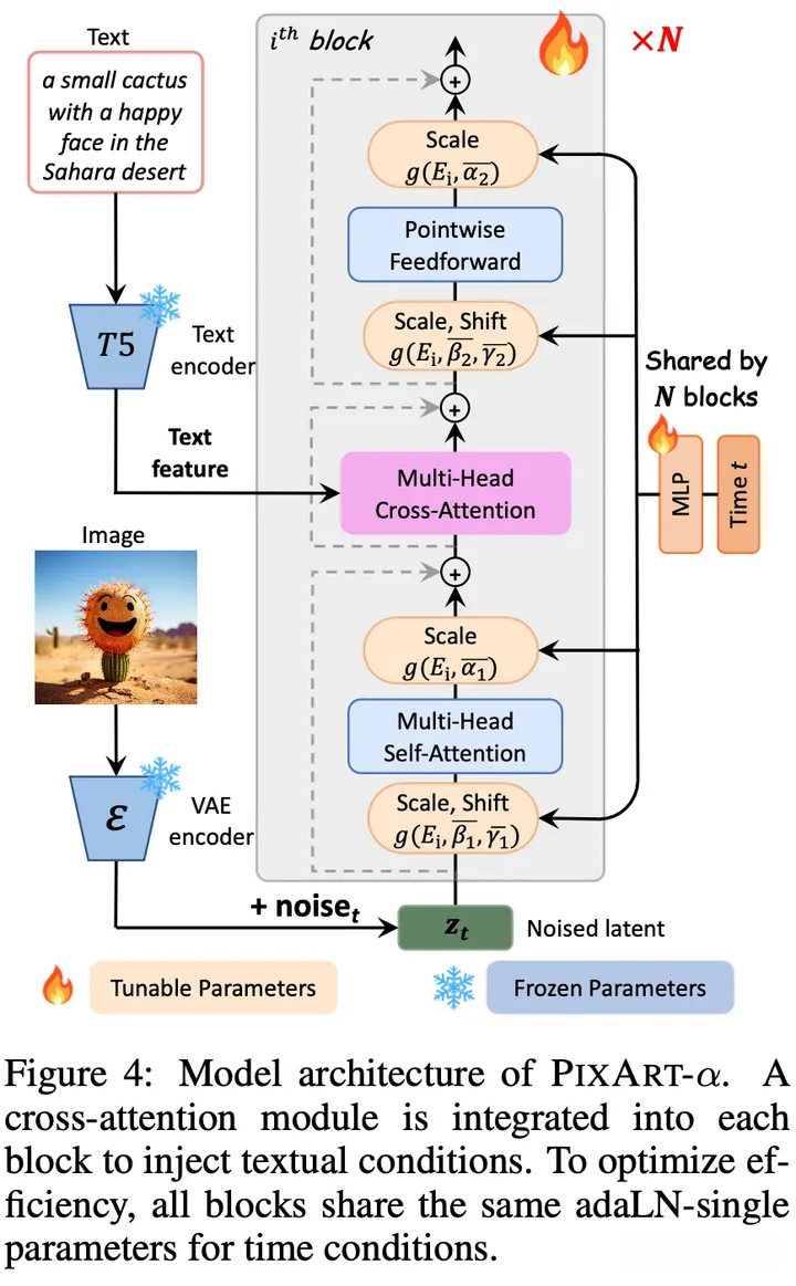 第一阶段仅做预训练工作,其最终目标则是构建一个基于文本引导的条件扩散模型.完成第一阶段训练后,对模型架构进行相应优化.具体措施包括:在DiT块中加入cross-attention机制,以便捕获T5编码器提取的文本特征信息.为了避免微调过程引入的新参数干扰已有权重表现,我们采用零初始化的方式处理cross-attention模块的最后一层投影层.值得注意的是,零初始化在微调过程中是一种常见做法,旨在防止额外参数对原有性能的影响.其次,我们在网络参数优化方面进行了创新性尝试:将原始AdaLN算法进行了单片AdaLN改进.具体而言,在原始设计中每个DiT块都配置了独立的AdaLN层,但由于需要通过一个MLP获取六个尺度因子和偏移量(共计27%参数率),这一设计导致了较高的计算开销.改进方案则是采用共享MLP的方式统一管理所有DiT块中的AdaLN功能,同时在每个DiT块内增加一个可学习嵌入层来进行精细调节.这样一来既保证了各DiT块之间参数区分度的同时又有效降低了整体参数规模.在此基础上我们进一步优化了网络架构:舍弃class embedding模块以避免引入新的学习目标干扰原有权重分布.为了维持预训练权重的有效利用,我们选择固定时间步长(第500步)并设定初始值使得新增可学习嵌入层能够继承原有AdaLN模块的最佳参数设置.这一设定被命名为重参数化策略.