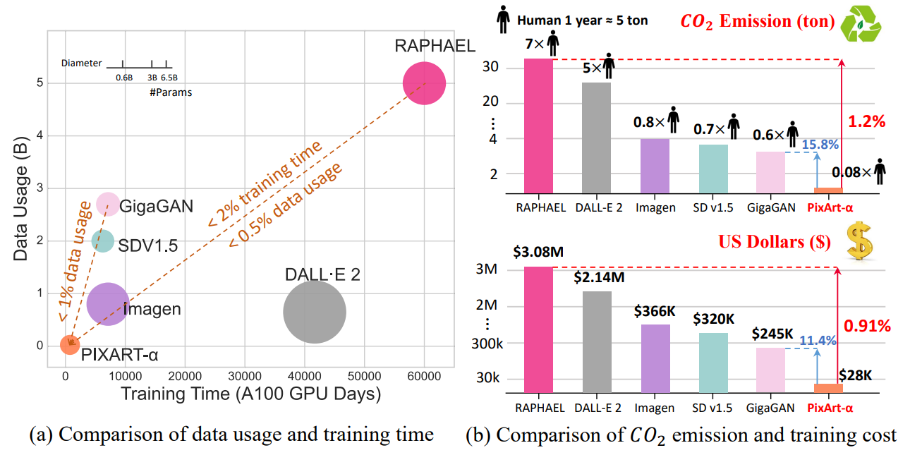 https://github.com/PixArt-alpha/PixArt-alpha](https://github.com/PixArt-alpha/PixArt-alpha "GitHub - PixArt-alpha/PixArt-alpha: PixArt-α: Fast Training of Diffusion Transformer for Photorealistic Text-to-Image Synthesis")pixel-α主打低成本训练,采用DiT架构,模型参数0.6B,训练时长只有sd1.5的10.8%,只用了25M数据。开源了训练全流程,还是很有诚意的,并且后面从sora开始的视频diffusion很多也是借鉴自pixel-α。
