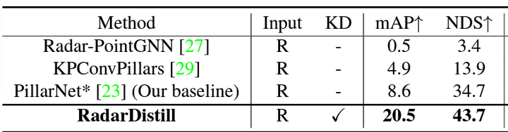RadarDistill: This method aims to improve the performance of radar-based object detection through knowledge distillation using data from LiDAR features. (2024)