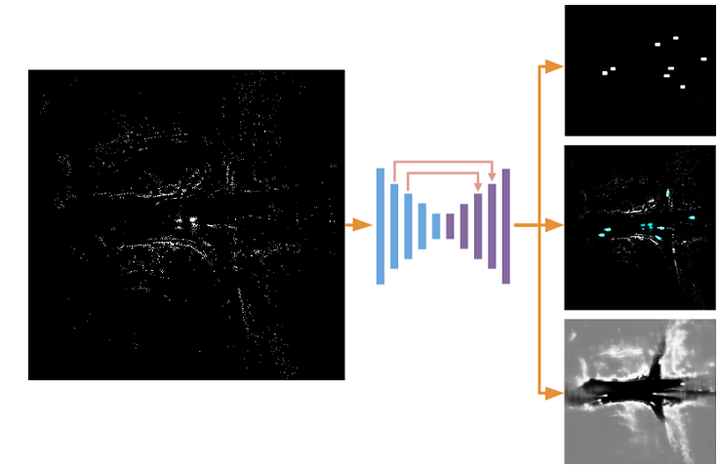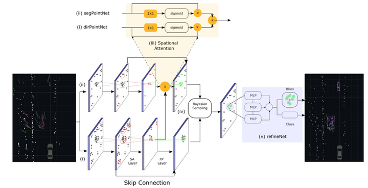 这项工作起源于NVIDIA。主要方法在于将连续五帧的点云数据进行融合处理(其中涉及车辆运动补偿技术)。随后生成网格化的特征表示。为了提高计算效率,在每个网格区域内计算所有点特征求平均值作为该区域的特征向量。网络架构简洁明了,并由一个U-Net编码器模块后跟三个解码器分支组成。这三个解码器分支分别用于目标分类、物体边界框预测以及自由空间分割三项任务。算法设计思路清晰明了,并可作为该类点云处理方法的基础基准方案。